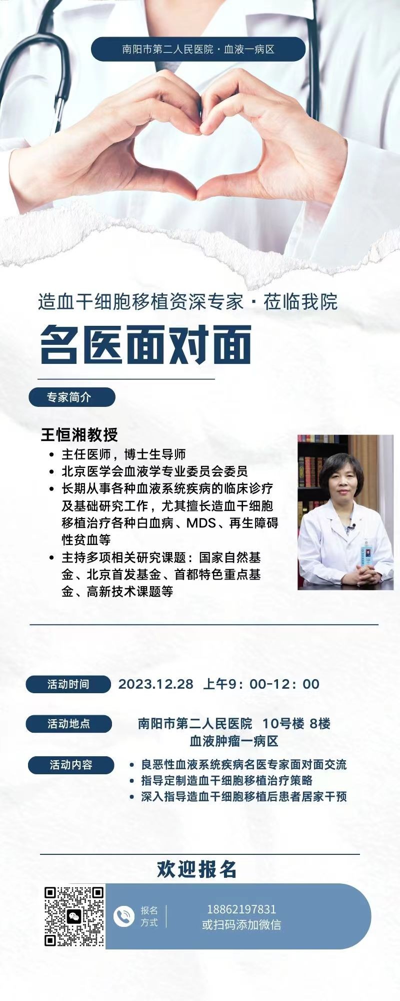 资深造血干细胞移植专家王恒湘教授莅临南阳二院血液科,本周四(2023年12月28日)上午9点--12点,开展义诊活动,造福家乡人民!义诊可指导血液病诊治,指导制定造血干细胞移植治疗策略,深入指导移植后患者全程管理。专家号有限,有需要的患者联系18862197831,提前电话预约!
